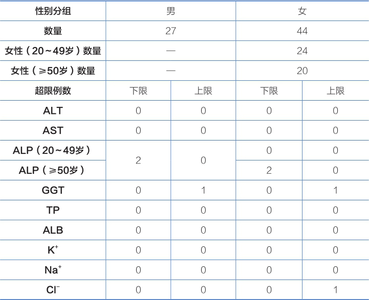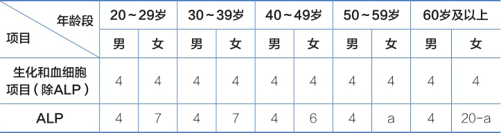 注:a代表该年龄段人数,验证ALP时,50岁以上女性保证有20例;原则上参考区间无性别差异的项目,验证例数男、女共计20例即可。由于本次验证项目中同时包括了参考区间有性别差异项目和无性别差异项目,考虑到实际操作的可行性,验证例数总体要求男女各20例。