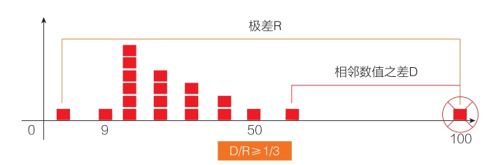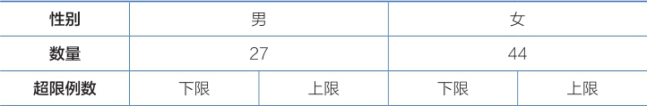 首先将检测结果按照大小排序并计算极差R,然后分别计算最大值和最小值与其相邻数值之差D;若D/R≥1/3,则将最大值或最小值视为离群值予以剔除;将余下数据重复前述步骤进行离群值检验,直至剔除所有离群值。因出现离群值而造成检测数据不足20个时,应另外选择符合要求的健康个体以补足20个,确保检测结果不含离群值。