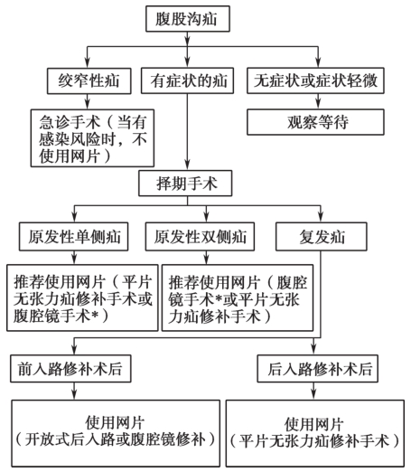 主要术式有四种,经腹膜前法(TAPA)、完全经腹膜外法(TEA)、经腹腔内法(IPOM)、单纯疝环缝合法。一般而言,外科医师应当选择自己最擅长、最有经验的手术方法。若腹股沟区域疝患者无腹膜前间隙手术既往史、腹水及有并发症的疝,则开放式手术和腹腔镜手术均可进行。学术上近年来逐渐倾向于使用腹腔镜手术修补双侧腹股沟或股疝。