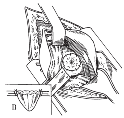 A.暴露疝囊;B.将花瓣状充填物缝合在疝环周围;C.缝合网片