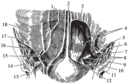 1.脐外侧襞;2.脐中襞;3.半环线;4.腹壁下动静脉;5.精索动静脉;6.输精管;7.股神经;8.股动静脉;9.腹股沟韧带;10.股环;11.陷窝韧带;12.联合腱;13.膀胱上窝;14.腹股沟内侧窝;15.精索;16.内环;17.腹股沟外侧窝;18.腹壁动脉襞