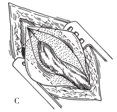 指应用自身组织做腹横筋膜、腹股沟前壁或后壁修补,适用于疝环缺损不大、腹内压增高因素不明显的病例。最常用的是腹股沟管管壁修补(Bassini法):游离并以纱布条提起精索。在其深面用粗丝线将腹横腱膜弓(或联合肌腱)与腹股沟韧带内侧面做间断缝合,自上而下缝合3~5针。最后一针应将腹横腱膜弓(或联合肌腱)缝于耻骨结切的骨膜上,以防止最内端残留三角形空隙,术后易引起疝的复发。近内环一针与精索间的距离可通过一小指尖为宜,避免过紧而引起精索血液循环障碍。将精索放置于新位,再次检查无出血后,以粗丝线间断缝合腹外斜肌腱膜。分层缝合皮下及皮肤层。