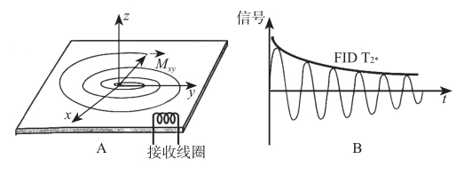 激励结束后,磁化矢量 M 回到平衡位置的弛豫过程中,释放吸收的能量,产生磁共振信号。弛豫过程是磁共振系统特有的物理过程,分为纵向弛豫和横向弛豫。纵向弛豫过程是质子从高能级回到低能级,并通过热交换将共振所吸收的能量释放给其他类型的原子核,表现为纵向磁化矢量逐渐恢复直至最大值(平衡状态),常用时间常数T 1 描述。质子处于主磁场和邻近质子磁场的综合作用下,磁场强度并不均匀,导致每个质子的自旋频率有微小差异,产生相散。横向弛豫过程是质子与质子之间磁矩的相互作用,其结果是磁化矢量 M 0 在 XOY 平面上的投影 M xy 逐渐衰减为0,即横向磁化矢量逐渐减小直至消失。常用T 2 时间描述横向弛豫过程或自旋-自旋弛豫过程。