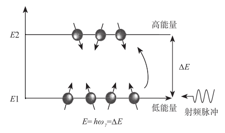 射频脉冲是一种交变磁场,通常用 B 1 来表示,用于激励平衡状态的原子核系统。低能级的质子通过吸收射频的能量后,跃迁至高能级状态,从而达到高能级的质子数目多于低能级质子数,使质子系统处于受激状态。