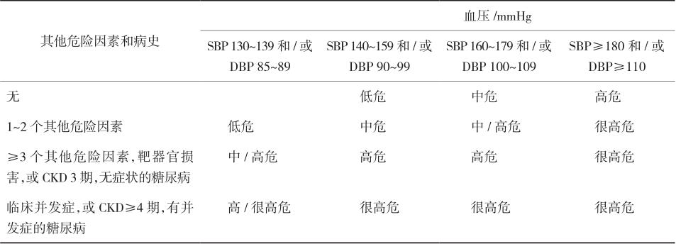 注:①SBP为收缩压,DBP为舒张压;②危险因素:年龄≥55岁,吸烟,血脂异常,早发心血管病家族史,肥胖和缺乏体力活动; ③ 靶器官损害:左心室肥厚,颈动脉内膜增厚或斑块,肾功能受损;④临床相关疾病:脑血管病、心脏疾病、肾脏病、周围血管病、视网膜病变和糖尿病。
