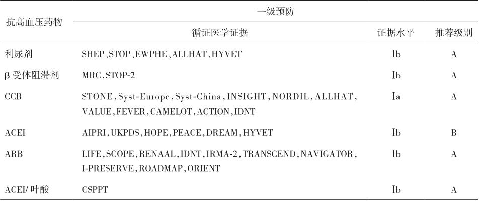 脑卒中的一级预防中高血压药物的优先推荐为:CCB、ARB和利尿剂。上述推荐基于循证医学证据(表3-3)。其中我国以脑卒中为终点的试验研究极为突出。