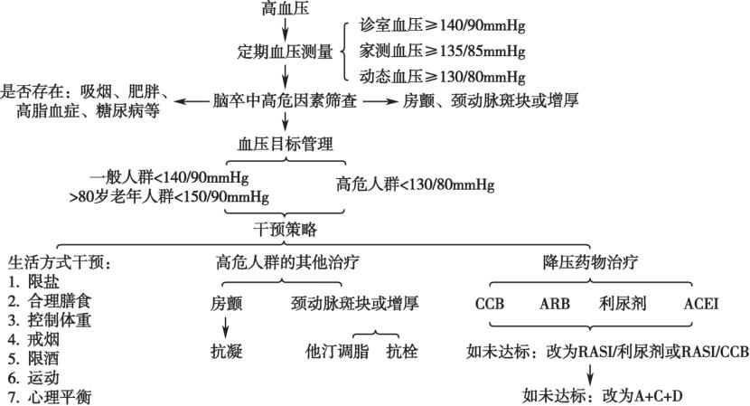 应对高血压患者进行规范血压监测;对脑卒中高危因素进行筛查;高血压早期及全程采用治疗性生活方式管理患者;对生活方式干预效果不佳者及早启动抗高血压药物降压治疗。