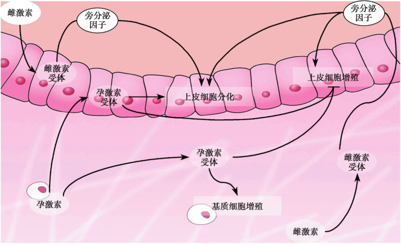 子宫组织主要包括3层:外层为肌肉层,中间为基质层及其中的腺体,内层为子宫腔上皮层。月经期和妊娠期子宫的变化受来自卵巢的类固醇激素的调控,是一个激素主导的过程。从本质上来说,来自卵巢的两种主要类固醇激素——雌激素和孕激素,协同作用使子宫进入容受态,在此过程中上皮细胞和基质细胞会呈现出形态和功能上的改变。