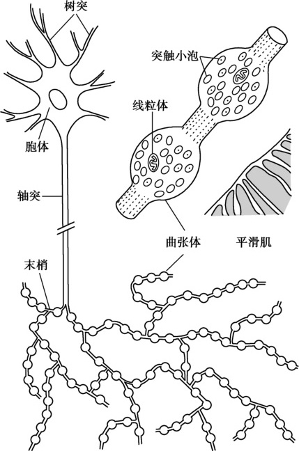 与神经肌肉接头间特化的终板样结构不同的是,支配内脏平滑肌的神经纤维在进入平滑肌组织后多次分支,分支上形成许多念珠样的曲张体(varicosity),内含大量囊泡,是递质储存的场所和释放的来源(图5-2-5)。曲张体和内脏平滑肌细胞之间的距离较大,可达100nm,肌细胞膜上的受体散在分布在整个细胞膜表面。因此,神经和内脏平滑肌之间的兴奋传递耗时较长。值得注意的是,外源性神经冲动可以调节内脏平滑肌的兴奋性并影响平滑肌收缩的强度和频率,但是各种体液因子才是调节平滑肌舒缩功能活动的主要因素。如前所述,一些体液因素可以在平滑肌细胞不产生动作电位的情况下,通过影响肌膜上的钙通道或者肌质网上的IP 3 R发挥作用。