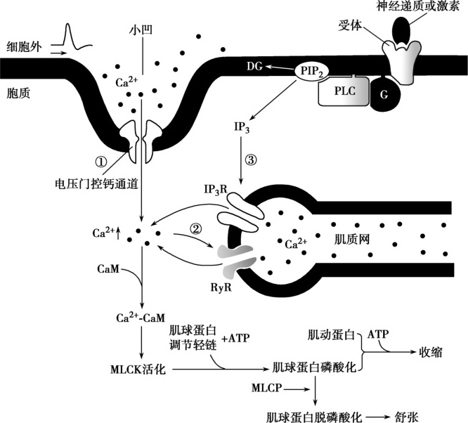 G.G蛋白;PLC.磷脂酶C;PIP 2 .二磷酸磷脂酰肌醇;DG.二酰甘油;IP 3 .三磷酸肌醇;IP 3 R.三磷酸肌醇受体;RyR.雷诺丁受体;CaM.钙调蛋白;Ca 2+ -CaM.钙-钙调蛋白复合物;MLCK.肌球蛋白轻链激酶;MLCP.肌球蛋白轻链磷酸酶。