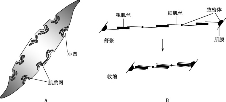 A.平滑肌细胞膜上的小凹及与其对应的肌质网;B.平滑肌细胞内的粗、细肌丝排列和收缩时的肌丝滑行示意图。