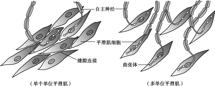 根据肌细胞之间的相互关系和功能活动特征,可将平滑肌分为单个单位平滑肌和多个单位平滑肌(图5-2-3)。前者又称为内脏平滑肌,子宫平滑肌属于此类。