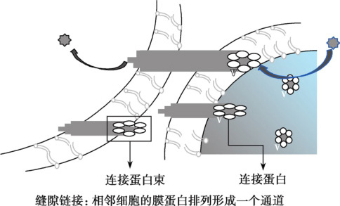 缝隙连接是一种动态性结构,其形成机制复杂,膜电位、pH、离子浓度、激素、机械牵拉和细胞黏附分子等可以调节连接蛋白的转录和翻译过程,并可调节其向细胞膜运输、组装形成功能性连接小体的全过程。另一方面,缝隙连接也可以通过变小甚至关闭来保护细胞或是整个组织的损伤。