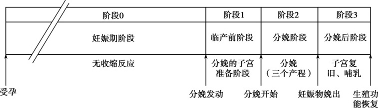 自妊娠至分娩结束的生理过程中,子宫功能状态发生显著改变,可分为妊娠期、临产前、分娩及分娩后,共4个阶段(图5-3-1)。每个阶段分别对应妊娠及分娩中的子宫肌层与宫颈的不同生理变化(Challis et al.,2000;Petraglia et al.,2010)。