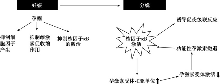 人类分娩启动的确切机制尚未得到全面而确切的阐明。越来越多的研究发现,人类分娩与母胎组织中白细胞侵入、核因子κB(NF-κB)激活,以及促炎性细胞因子表达增加有关,即人类分娩是一个炎症反应过程。人类分娩启动时或是分娩启动后的极短时间内,母胎局部组织内表达增加的趋化因子和细胞黏附分子可以诱导外周血中的白细胞(主要是中性粒细胞、巨噬细胞,以及T细胞)侵入并浸润子宫肌层、宫颈,以及胎膜等组织,并使这些组织中的促炎性细胞因子,如部分白细胞介素(IL)(IL-1β、IL-6、IL-8)和肿瘤坏死因子-α(TNF-α)等产生增加。后者通过自分泌、旁分泌及少数内分泌的作用,通过多种机制刺激子宫肌的收缩和重构、宫颈软化和成熟。同时,促炎性细胞因子还能通过正反馈调节机制招募更多的白细胞向子宫肌迁移,以扩大子宫肌的收缩效应并促进分娩。转录因子NF-κB参与众多细胞功能的调节活动,也是参与炎症反应的因子之一。分娩时,NF-κB有关的信号转导系统可通过正反馈调节促炎性细胞因子的产生。但是,有研究发现,早产的发生也与炎症反应有关,并可伴随胎儿发育异常。因此,在人类分娩过程中,炎症反应发生的确切机制还需要深入研究。