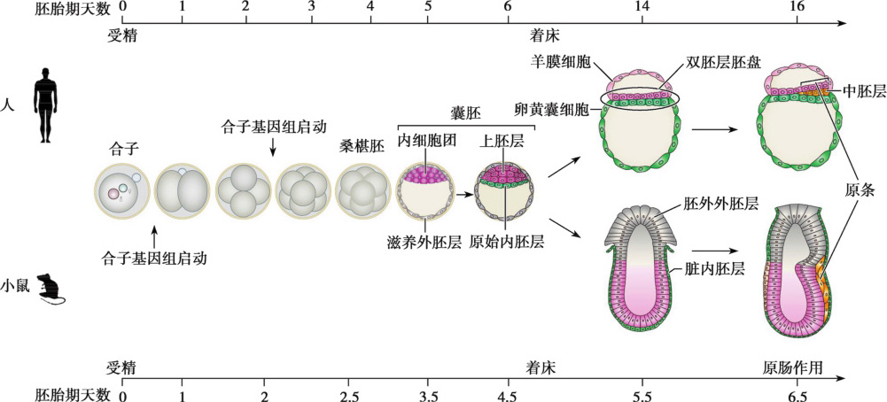 精卵结合形成合子标志着哺乳动物发育的起始。合子经过卵裂形成2细胞、4细胞、8细胞、桑葚胚及囊胚,并分化形成内细胞团和滋养外胚层两种不同细胞群,即第一次细胞谱系的分化。植入后(人在1周左右,小鼠在胚胎期4.5日左右),胚胎细胞快速增殖分化,出现第二次细胞分化,形成上胚层和下胚层。人类胚胎中,上胚层和下胚层组成盘状结构,称为双胚层胚盘。第二次细胞分化后,胚胎进一步通过原肠作用(人起始于15日左右,小鼠起始于胚胎期6.5日左右)形成内、中、外三个胚层,并最终发育成各种组织器官(张卫红,2018)。