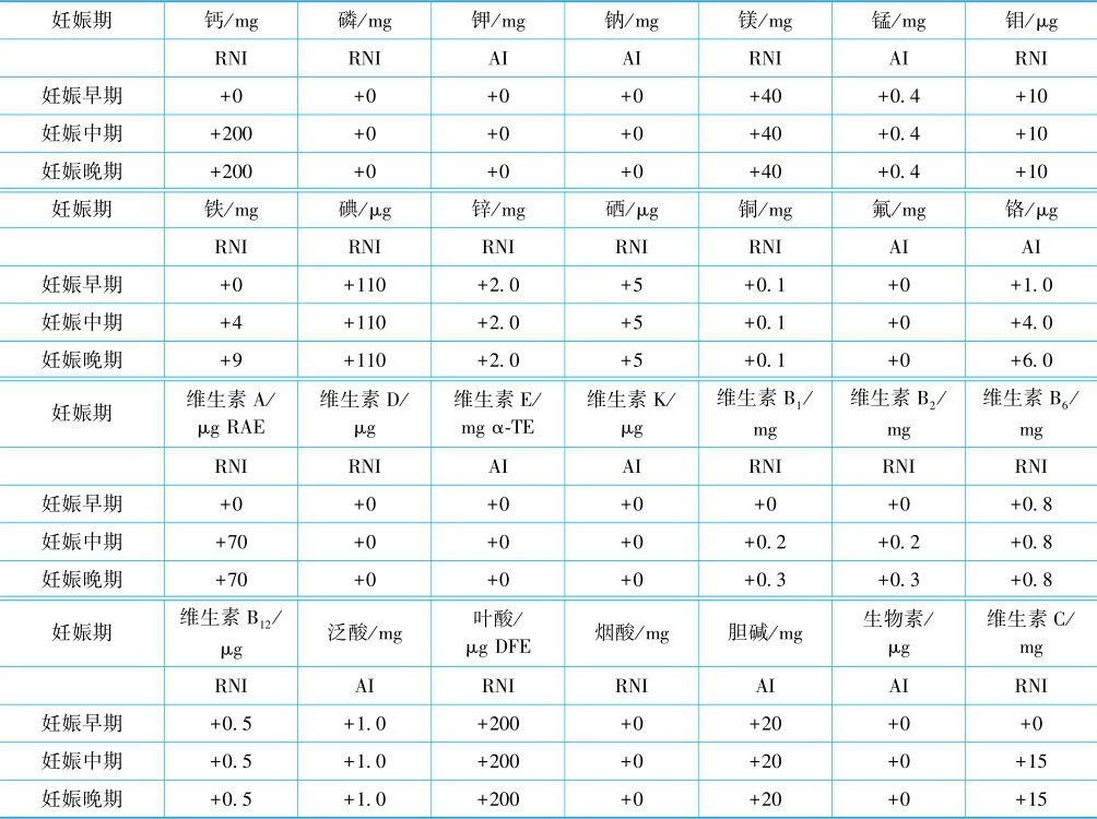 注:RNI,推荐摄入量;AI,适宜摄入量;RAE,视黄醇活性当量;α-TE,α-生育酚当量;DFE,膳食叶酸当量。“+”表示在非育龄期妇女推荐量基础上的增加量。
