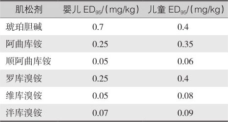 与成人相同,静脉注射琥珀胆碱起效最快,婴儿的药物分布体积广,单位体重对琥珀胆碱的需要量明显高于年长儿和成人。但如果按照体表面积计算,剂量则无显著差异。常用肌松剂及其95%有效剂量(ED95)见表4-1。使用琥珀胆碱后,儿童发生心律失常、高钾血症、横纹肌溶解、肌红蛋白血症、咬肌痉挛和恶性高热的机会比成人更高。因此,儿童和青少年常规选择性手术中最好避免使用琥珀胆碱。
