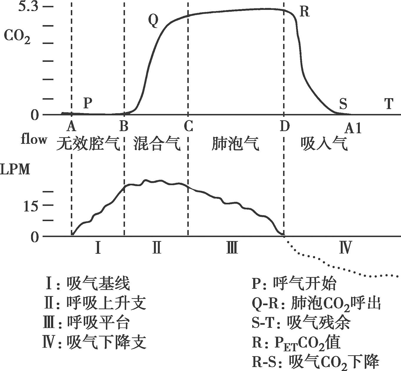 P ET CO 2 波形图(图4-2,图4-3)机械控制呼吸的CO 2 曲线图和肺泡气平台表现规则而均齐,正常一呼吸周期P ET CO 2 波形图近似矩形如图4-2,PQR为呼气期,RS为吸气期。整个周期分4个时相:Ⅰ时相,相对于AB段,位于基线零点,代表吸气终止,呼气开始,气道内为解剖无效腔气体。Ⅱ时相,相对于BC段,为陡直上升段,呈S形,代表无效腔气体和肺泡气体混合过程。Ⅲ时相,相对于CD段,呈水平线或轻度上升,为呼气平台,代表肺泡排出的混合气,其末尾最高点R即为监测仪器显示的P ET CO 2 值。Ⅳ时相,相对于DA1段,为陡直下降段,降至基线,代表呼气终止,吸气开始,新鲜气体进入气道,一个呼吸周期结束。Ⅱ、Ⅲ时相间的夹角称α角,间接反映V/Q比值,α角增大说明无效腔量增多。
