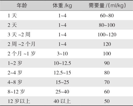 液体需要量与能量消耗有关,每消耗100卡能量需补液100ml。小儿每日生理液体需要量(表4-4)。