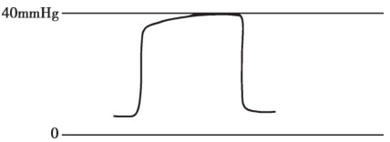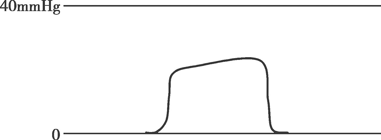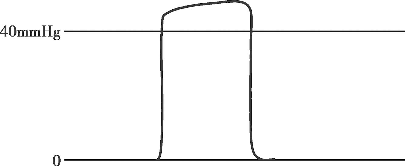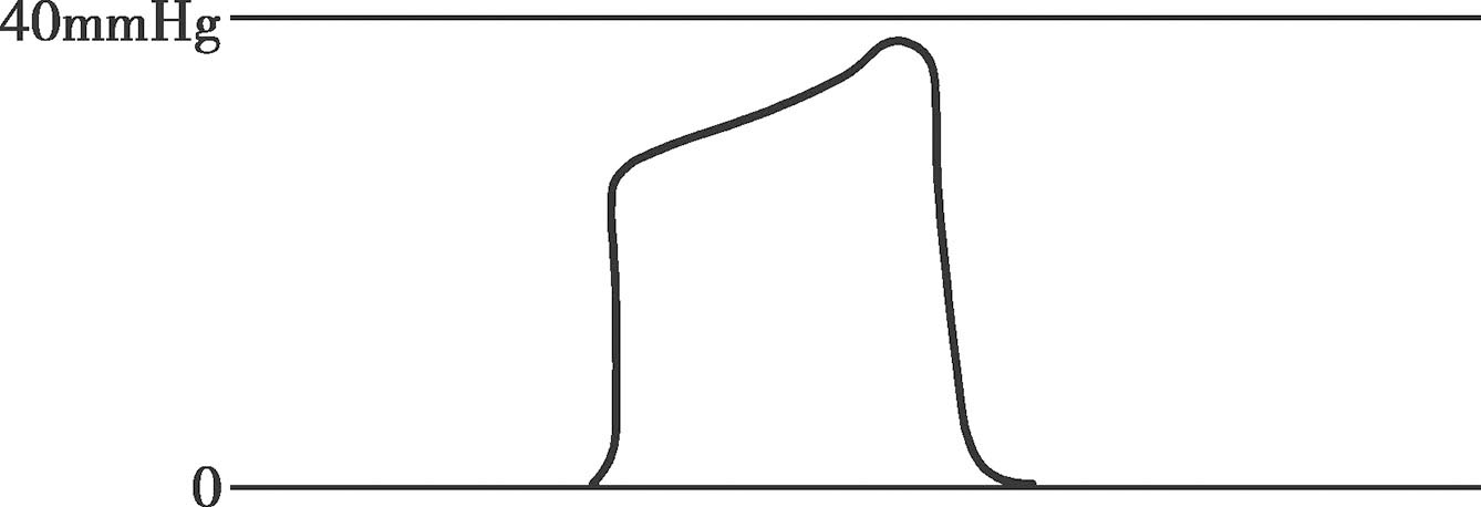 (5)呼气平台升高(图4-8):提示呼吸回路 CO 2 增多。多见于通气不足、CO 2 产量增加(如体温升高、甲状腺危象等)、突然放松止血带、腔镜手术时CO 2 吸收、静脉输注碳酸氢钠过快。新生儿代谢量大,CO 2 产生多,呼气平台较成人高。呼吸机频率过快造成通气量低时也可形成呼气平台升高。