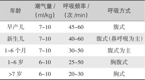 表4-10 不同年龄小儿的潮气量、呼吸频率和方式