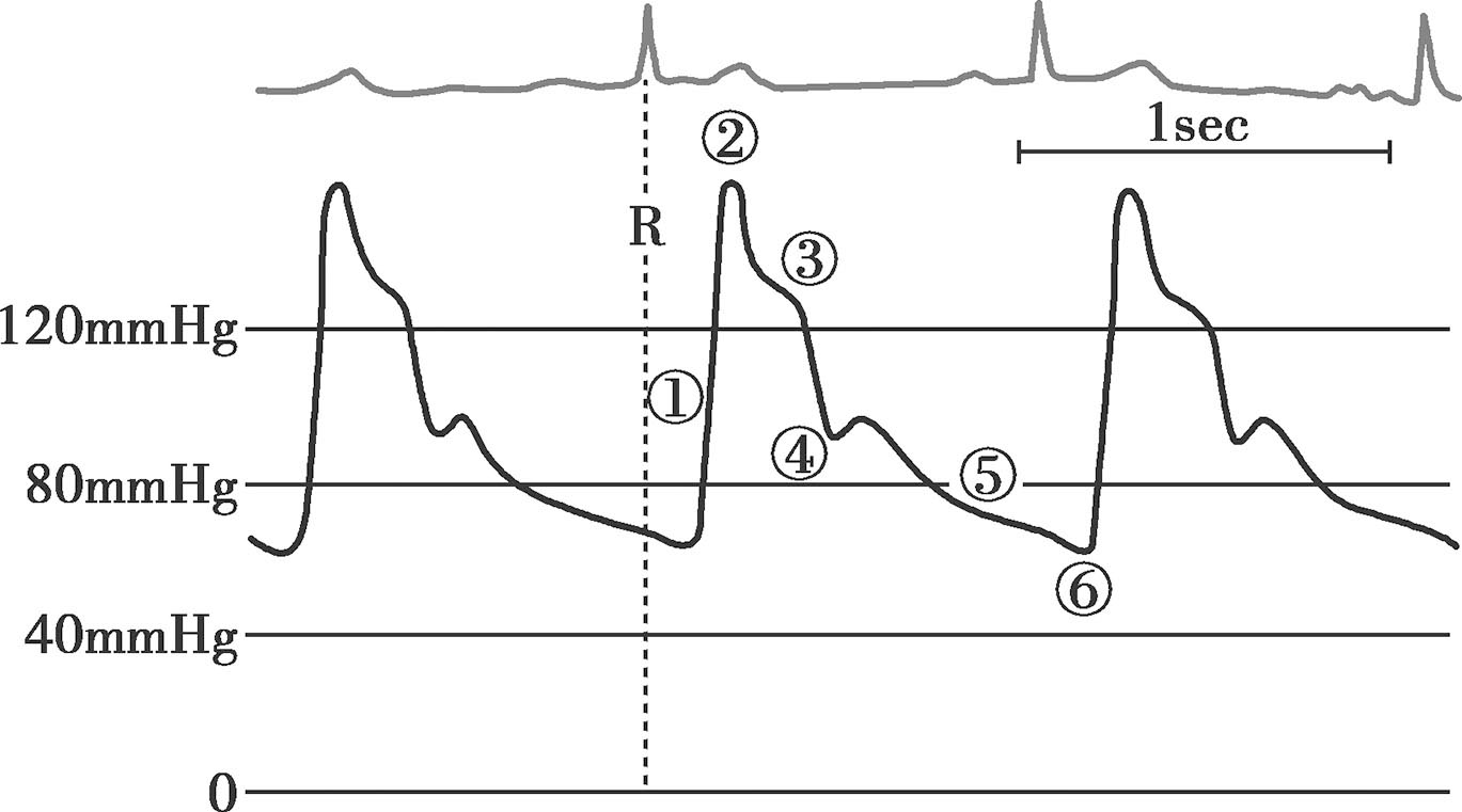 心室收缩期左心室快速射血,血压迅速升高,形成动脉压波形的上升支、峰值和下降支的前部。位于重搏切迹后面的下降部分,直到最低点是心室舒张期的动脉压波形,跟随在ECG的T波之后。重搏切迹反映了主动脉瓣关闭。在主动脉内的血液向外周动脉流动的过程中,也可以产生第二波峰,它因测压部位不同而变化,在桡动脉压力波形中常能看到位于第一波峰后的第二波峰,而股动脉压力波通常只显示一个压力波峰。