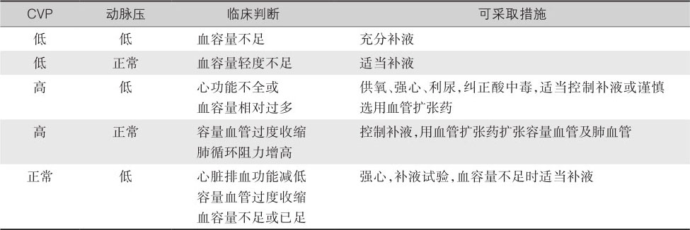 临床监测CVP主要用于评估回心血容量及右心射血功能,动态地观察CVP的变化,同时结合动脉血压来综合判断(表4-9)。