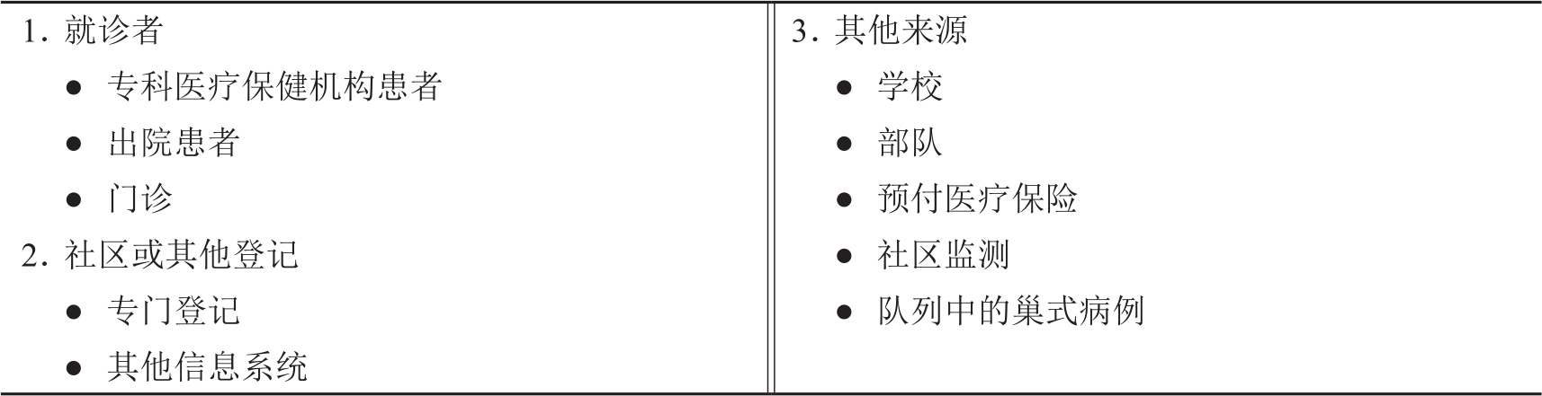 表2-1列出了病例的一些来源,包括现有的医疗保健机构、各类信息系统以及记录患者信息的机构。研究人员可以通过专门调查或筛查发现病例。病例来源会影响研究结果的推论。如果病例来源可以涵盖特定人群的所有可能病例,那么可以推算出整个人群的发病率。由于常规医疗工作和卫生项目需要管理患者,所以病例来源可能比较广泛,但是把各种来源的数据用于严格的科研可能存在一些问题。