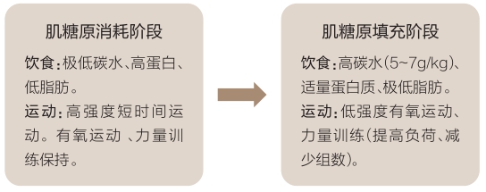 这个阶段,为了满足高碳水饮食,甚至可以适当提高整体食物热量(超量摄入的碳水化合物只会超量储存在肌肉和肝脏里,不会变成脂肪),而且蛋白质摄入量要给碳水化合物“让位”,脂肪更建议降到最低。