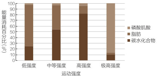 总体来说,运动时,运动强度越高,碳水化合物消耗越多,运动强度越低,脂肪消耗越多。而在运动强度特别高的时候,磷酸肌酸供能的比例就会非常大。