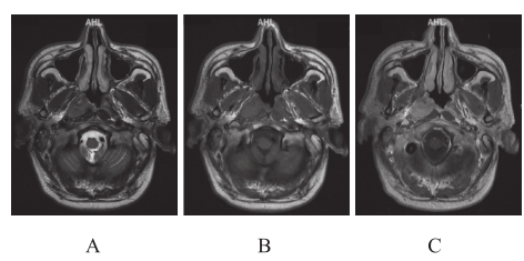 A—T2WI平扫;B—T1WI平扫;C—T1WI增强扫描。