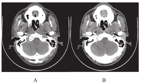 肿瘤可向邻近结构侵犯,局部出现异常软组织密度,增强扫描可见强化。肿瘤向外侧突破咽颅底筋膜侵及咽旁间隙时,表现为咽旁间隙密度增高,脂肪层变窄、消失;侵及颈动脉鞘区时,表现为增厚软组织;向下生长时,表现为口咽壁增厚;向前扩展时,表现为后鼻孔及鼻腔有肿物堵塞。
