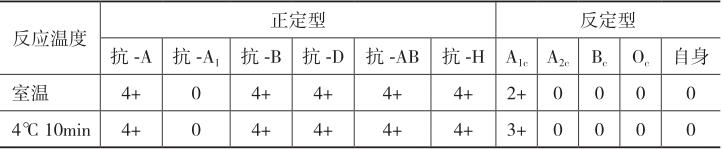 ABO正反定型不一致,RhD阳性,结果见表1-11,初步考虑:符合A 亚 B亚型血清学格局,血清中存在抗-A 1 。