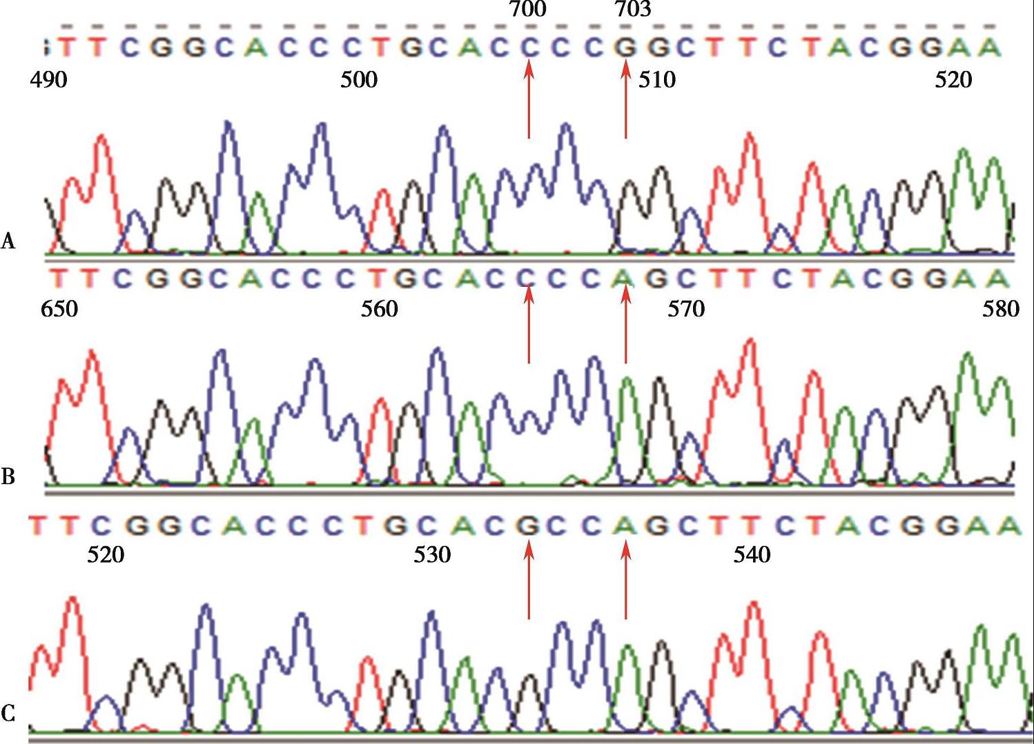 以正常A 1 /A 1 ,B 1 /B 1 ,O 1 /O 1 样本为对照,对 ABO 基因序列分析发现:除297G、526G、657T、703A、796A、803C和930G,使其表现 B 等位基因的特点外,还有1个c.700C>G的突变(图1-11),参照ISBT红细胞免疫遗传学和血型术语予以 ABO 等位基因的命名,按惯例以 ABO * A1.01 等位基因标准序列为参考序列,该序列的等位基因为 ABO * B ( A ) .02 。
