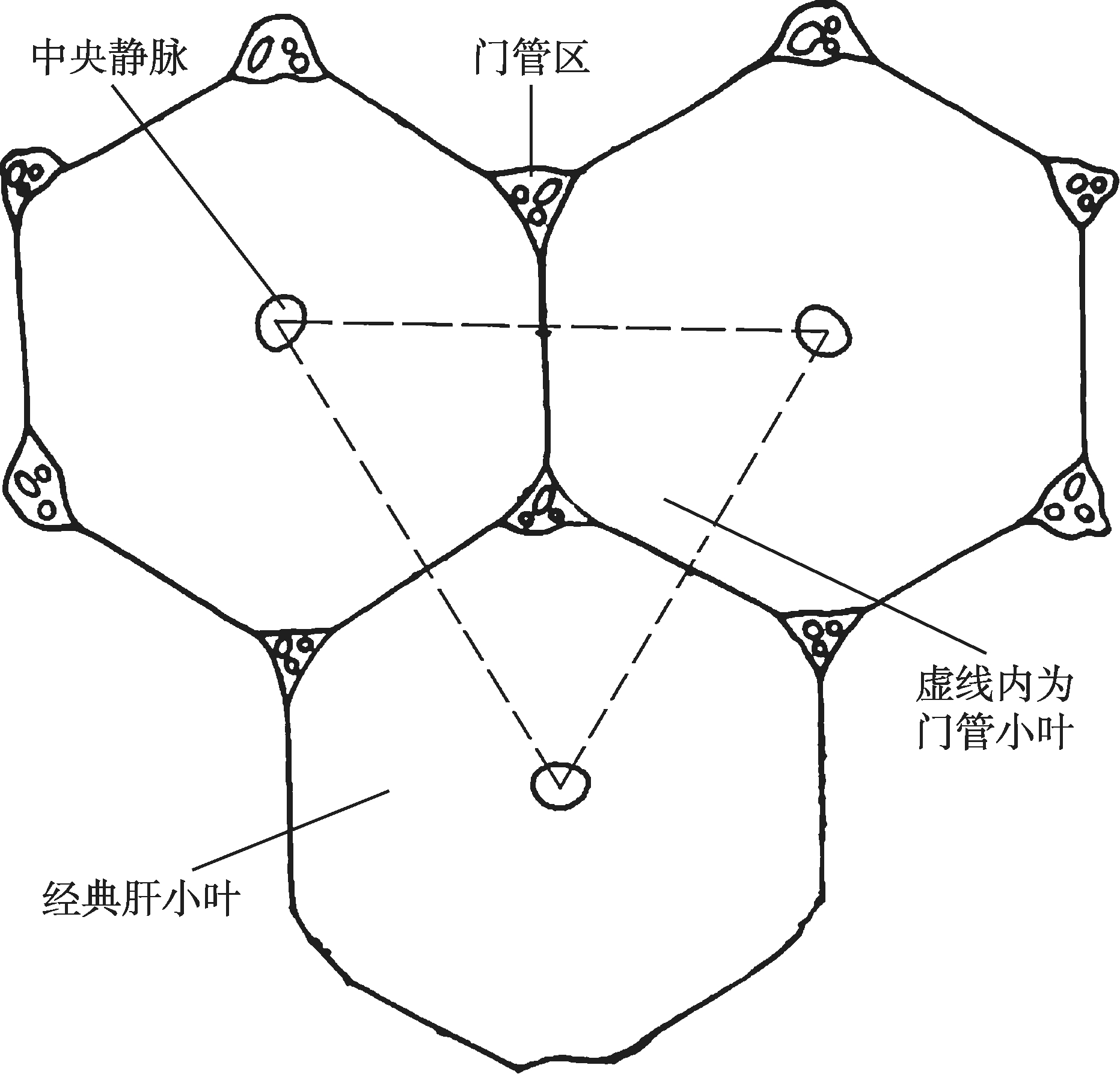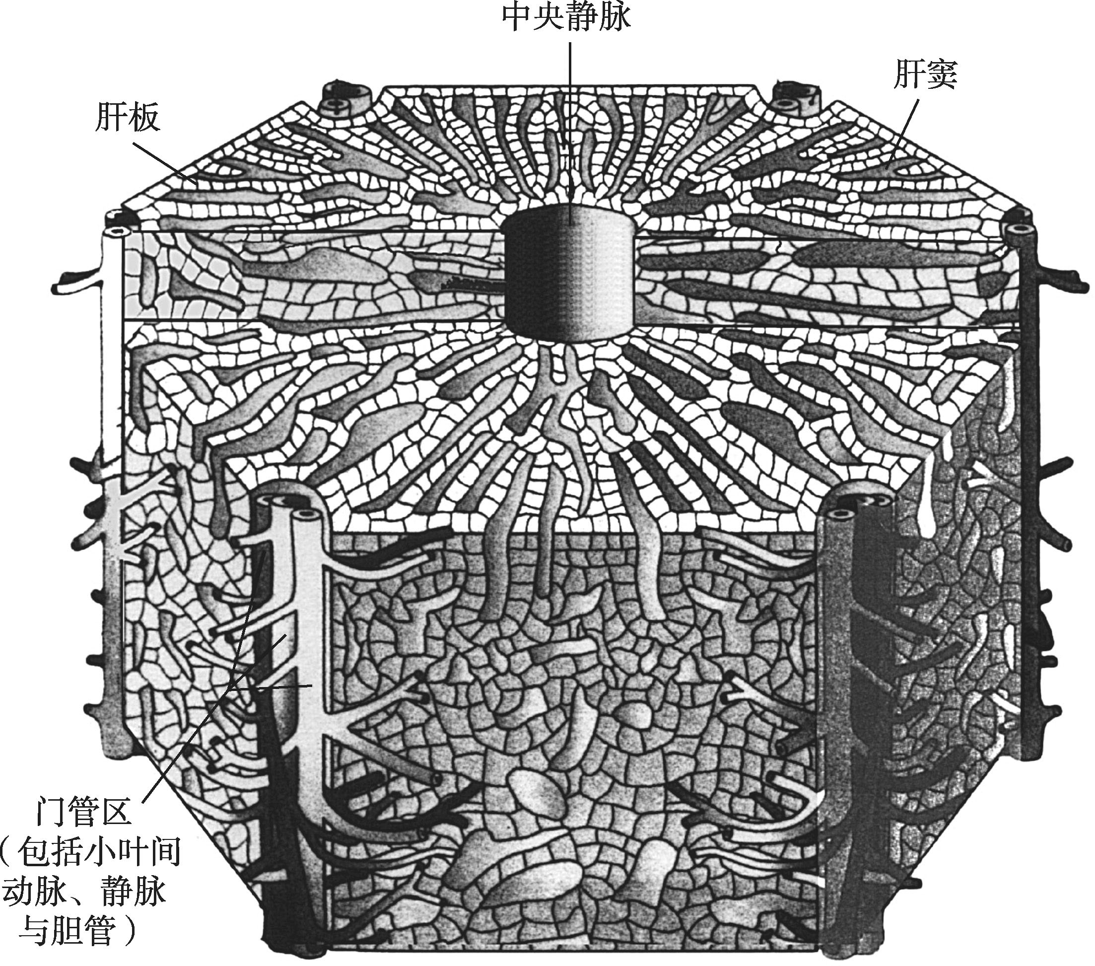 作为肝的结构和功能单位,除了以中央静脉为中心的经典肝小叶外,有学者还提出了门管小叶和肝腺泡的概念。门管小叶(portal lobule)立体形态大致为三角形柱体,它是以门管区为中轴,即小叶间胆管及伴行的小叶间动脉和小叶间静脉贯穿中轴,这些胆管和血管发出分支进入肝实质形成小叶结构(图4-16-4),周围以三个相邻的经典肝小叶的中央静脉连线为界。门管小叶的概念着重强调肝的外分泌功能,肝板似腺泡,胆小管似腺泡腔,而小叶间胆管似腺泡的导管。胆汁从门管小叶周边向中央汇集,流向小叶间胆管,构成一个肝外分泌小叶。门管小叶是胆汁分泌功能上的单位,习惯上较少用。
