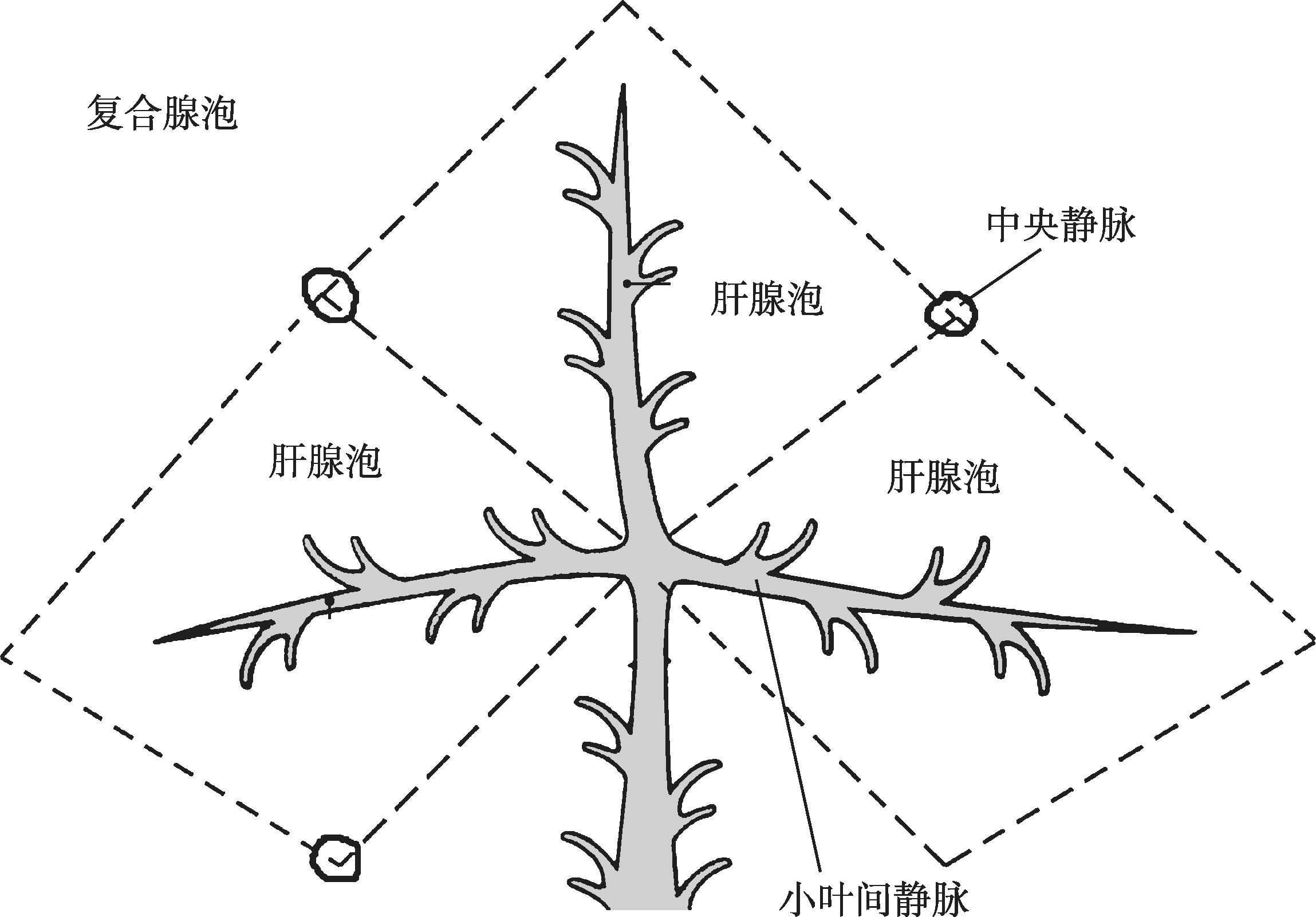 肝腺泡(liver acinus)是Rappaport等在1954年提出的肝脏结构单位的一种概念,是基于肝微循环与病理和再生关系而提出的。这一概念将肝结构和功能相结合,提出肝腺泡是肝脏结构和功能的最基本单位。肝小叶的血液来自周围几支终末血管,一个肝小叶分泌的胆汁也分别汇入周围几个胆管,因此Rappaport等认为肝小叶不是肝脏功能的最小单位,而提出肝腺泡的概念。肝腺泡体积较小,立体形态似橄榄,纵切面呈卵圆形。肝腺泡以门管区血管及胆管分支的终末支为中轴,两侧以邻近的两个中央静脉为界(图4-16-5)。每个肝腺泡接受一支终末血管的血供,分泌的胆汁汇入一个终末胆管,因此肝腺泡是肝脏微循环及胆汁分泌的最小结构及功能单位。