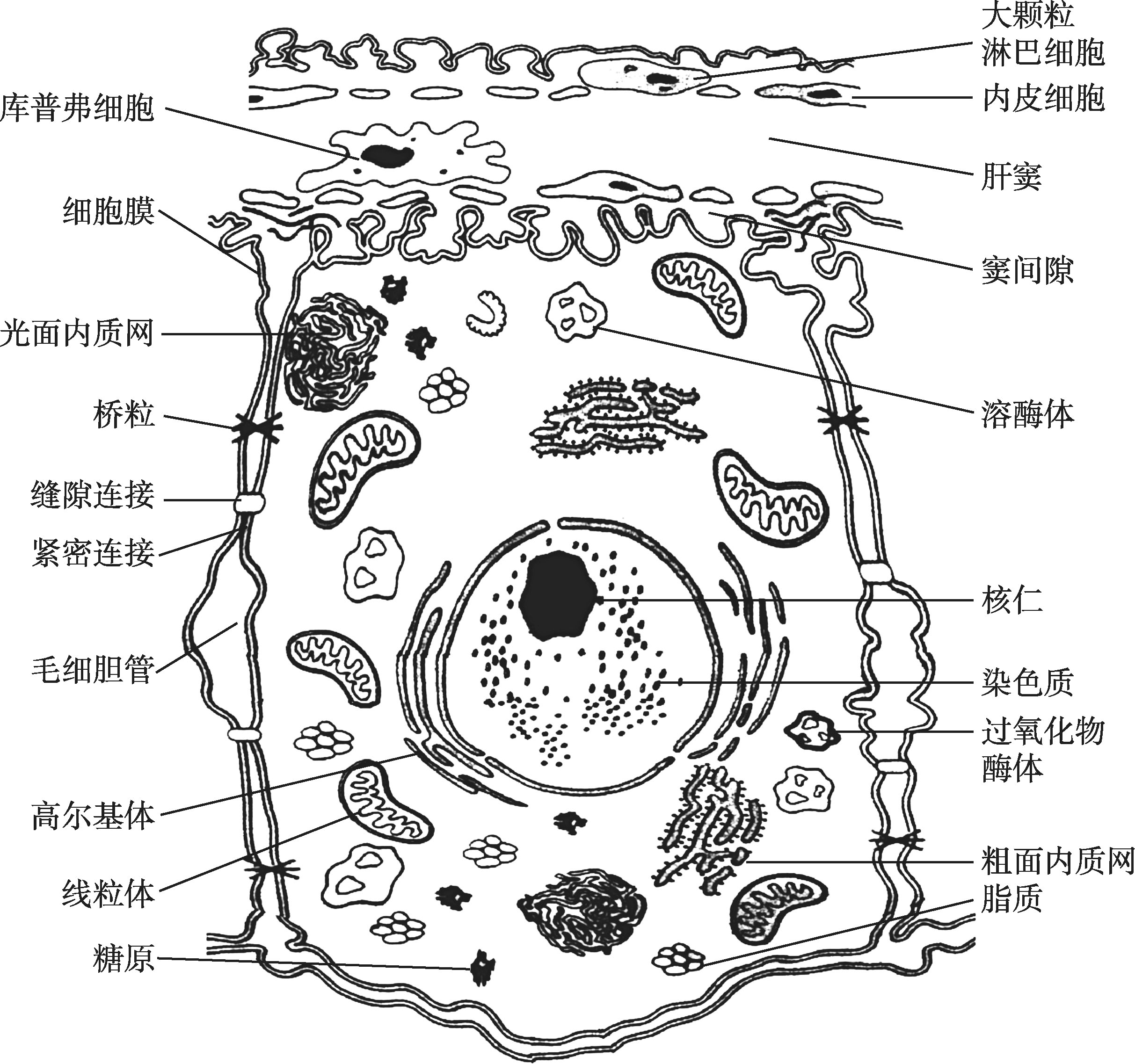 是组成肝脏的最主要细胞,占肝内细胞总数的70%~80%。肝细胞呈多面体形,直径15~30μm。肝细胞有三种不同的功能面,即血窦面、胆小管面和细胞连接面。血窦面和胆小管面有发达的微绒毛,使细胞表面积增大,有利于同血液进行物质交换。相邻肝细胞之间的连接面有紧密连接、桥粒及缝隙连接等结构。有些肝细胞之间还有贯通的细胞间通道。