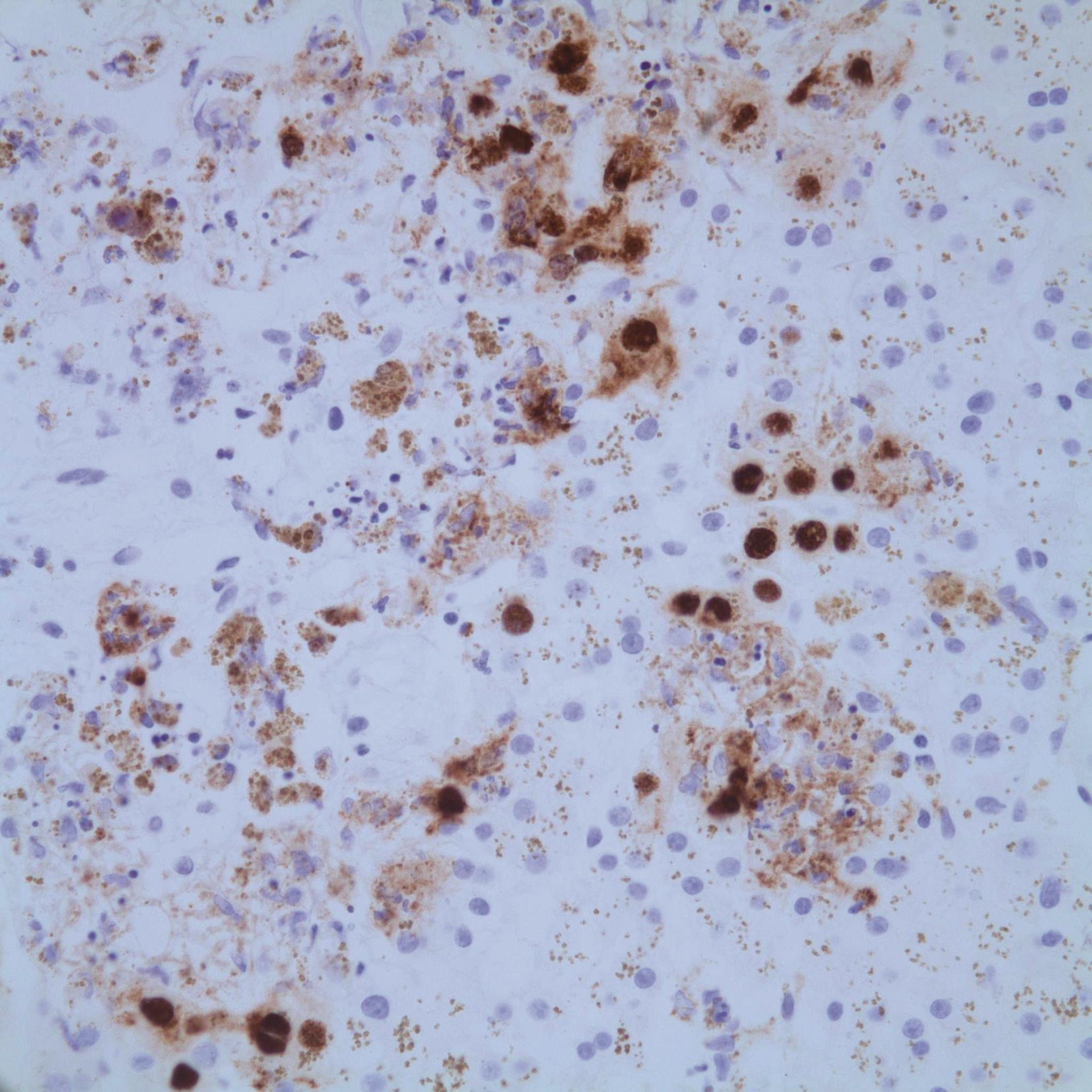 腺病毒肝炎常见于免疫缺陷的儿童或成人,如HIV患者,造血系统恶性肿瘤或移植后患者。病理改变主要表现为广泛的肝细胞坏死和轻微的炎症反应,肝细胞内易查见病毒包涵体(图4-18-3)。病毒包涵体位于肝细胞核内,圆形、嗜碱性、淡染。此型病毒常引起严重的肝炎,并导致肝衰竭,预后差。腺病毒免疫组化染色(图4-18-4)和外周血病毒DNA定量可证实病毒感染。