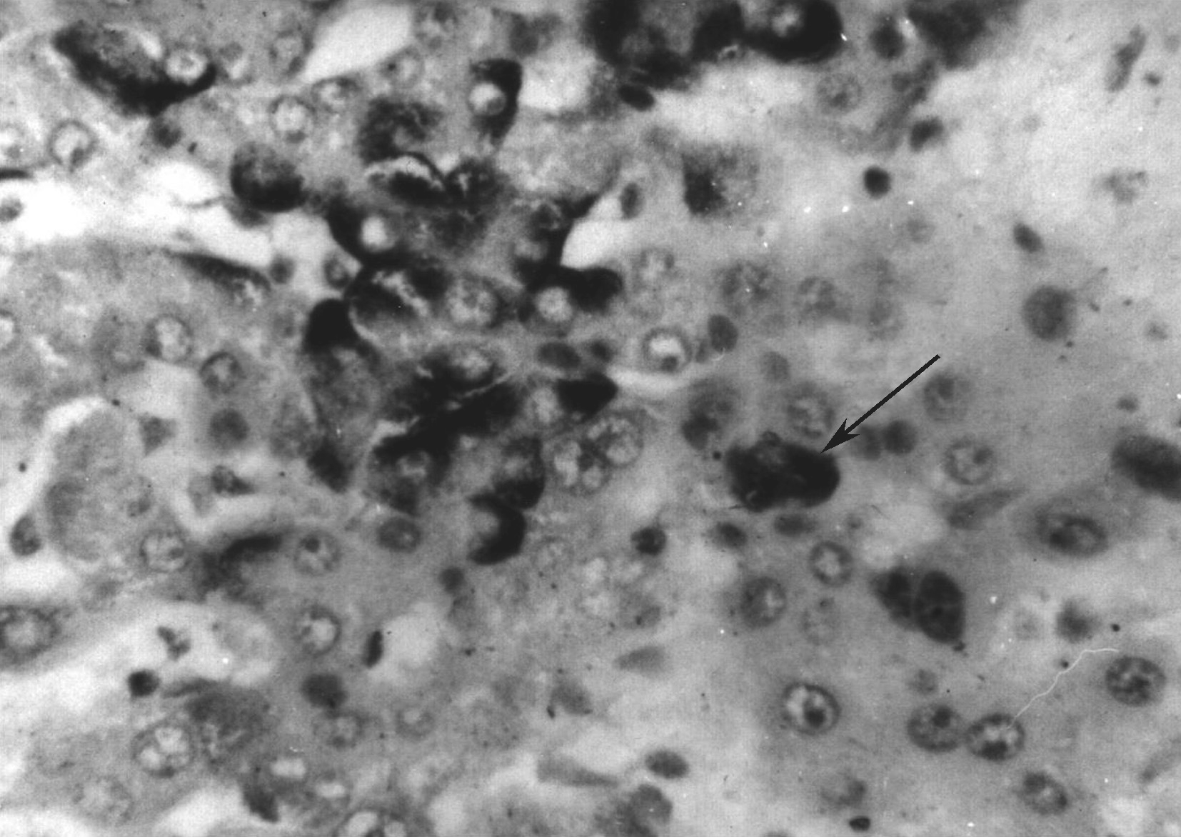 在坏死区和门管区浸润的炎症细胞以CD3 + CD8 + 细胞为主,提示细胞毒性T细胞对肝细胞的免疫攻击;在恢复期CD3 + CD8 + 细胞明显减少。用免疫组织化学方法可检测组织切片中的HCV抗原,阳性物质呈均质颗粒状分布于肝细胞核内(核型)或胞质中(质型)。在胞质中呈弥漫分布者为均质型,聚集成块者为包涵体型。HCVAg阳性肝细胞呈单个散在型或片状分布,多位于肝小叶周边部,肝小叶中央较少。应用原位分子杂交技术可见肝细胞癌癌旁肝组织中阳性肝细胞内的HCV RNA阳性颗粒呈质型和核型,在质内可呈包涵体型。