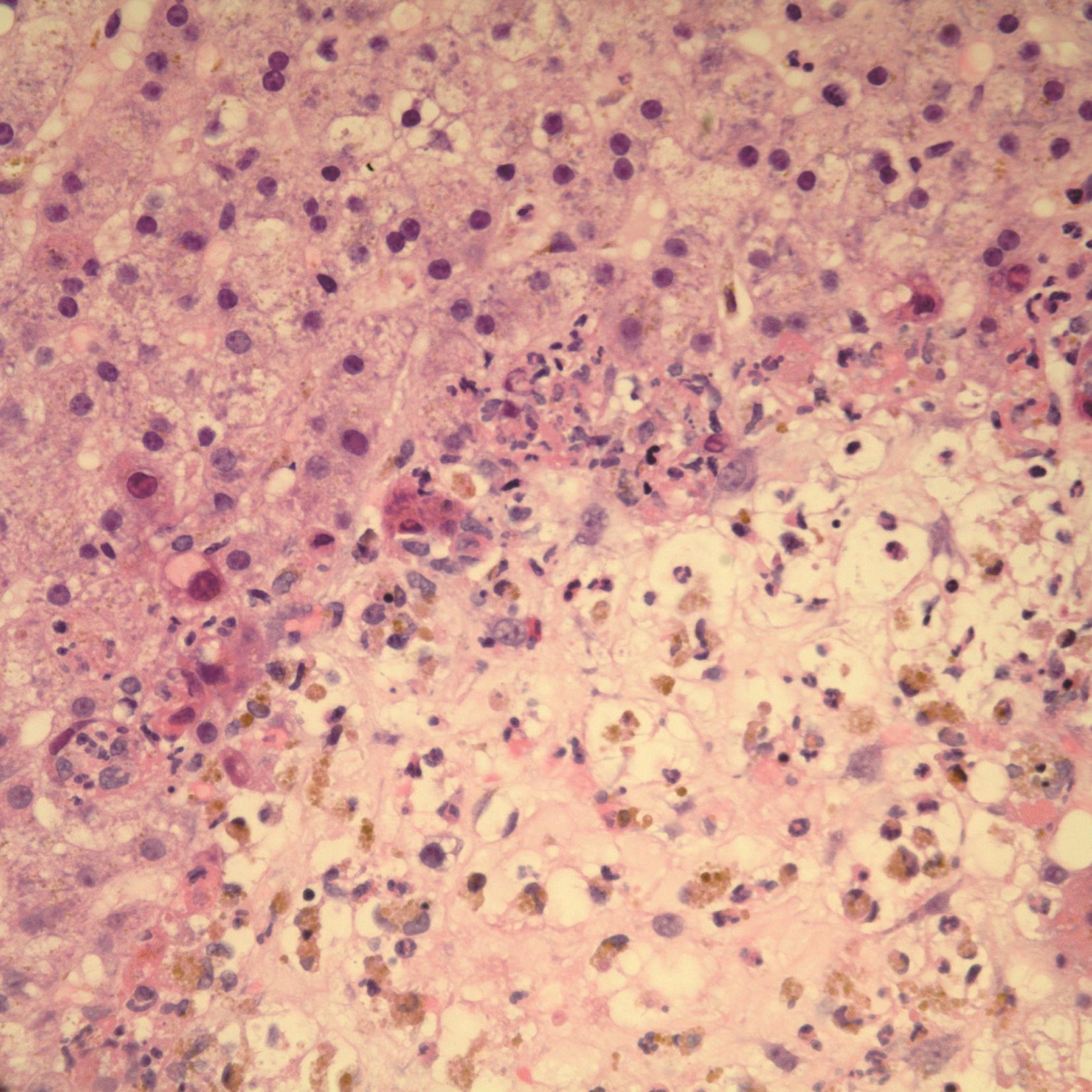 组织学检查,病变主要见于中央区,随着病变的加重,病变可扩展到周边区,此时肝细胞弥漫性大块性或亚大块性坏死,仅在小叶周边残存少量的肝细胞,其间散布着较多的炎症细胞,包括巨噬细胞、淋巴细胞、单核细胞、少数中性粒细胞和嗜酸性粒细胞。嗜银纤维染色证明肝小叶网状支架尚存,此为急性黄色肝萎缩的特征。病变发展,变性坏死的肝细胞被吸收,肝窦扩张充血、出血,Kupffer细胞增生并吞噬被破坏物质、胆色素和脂褐素等,无肝细胞再生,呈急性红色肝萎缩图像。超过50%的病例肝组织内可见淤胆现象,网状支架不塌陷,或少量不完全塌陷,无Ⅰ型胶原形成,可见少量Ⅲ型胶原形成。连续切片免疫组化染色显示多数坏死区周围可出现胆管样或腺泡样肝细胞团,沿着无塌陷网架有序再生。病变极重者,几乎全部的肝细胞溶解而仅残存门管区胆管,患者很快进入深昏迷状态。由此可知肝实质的坏死量与患者的存活率有着密切的关系。坏死>2/3者,多不能存活;反之,肝细胞保留50%以上,肝细胞虽有变性和功能障碍,度过急性阶段,肝细胞再生迅速,可望恢复。如发生弥漫性小泡性脂肪变性,预后往往较差。