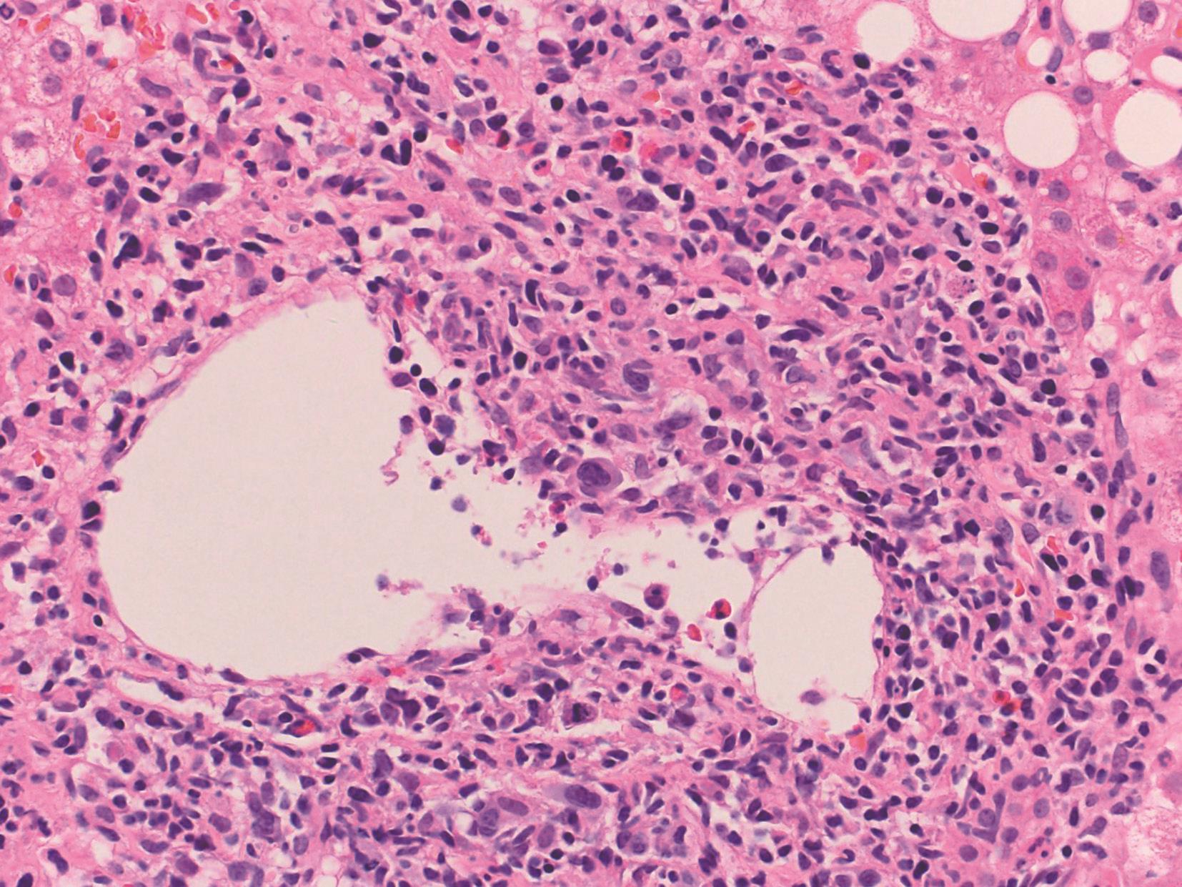 急性丙型肝炎小叶内可见灶状大泡脂肪变性,可见嗜酸性小体,肝窦内单个核细胞常排列成串;门管区炎症较重,小胆管损伤、周围淋巴细胞聚集或淋巴滤泡形成较其他型为多见。