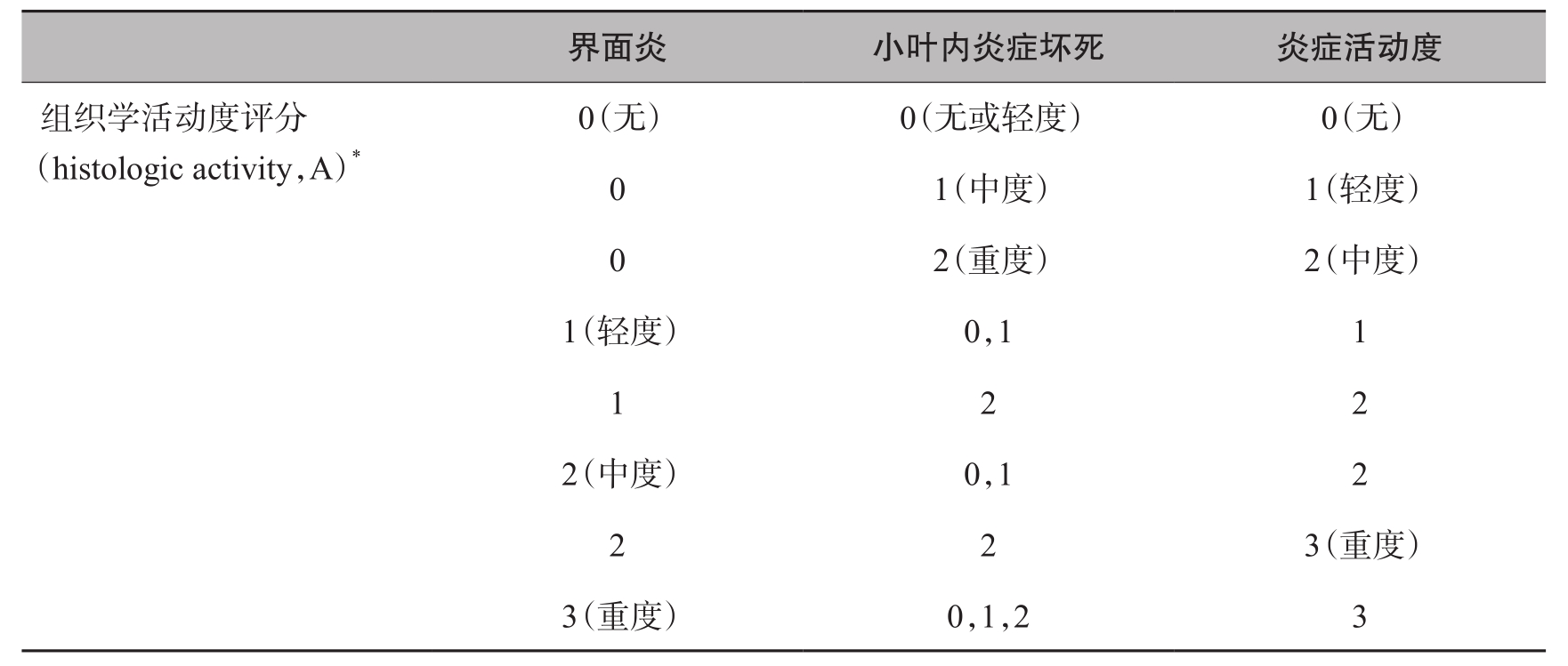 * 组织学活动度A根据界面炎和小叶内炎症坏死程度综合确定。