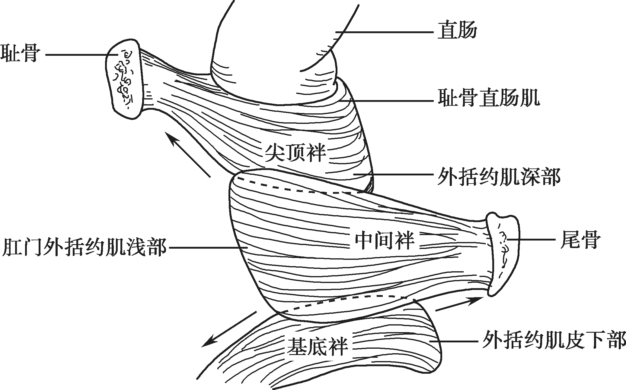 浅部通过肌纤维的延伸附着于尾骨,与结缔组织结合形成肛尾韧带,在此水平以上,深部与后方没有附着,而是通过耻骨直肠肌来维持。肛门外括约肌的最深层与耻骨直肠肌关系密切,而耻骨直肠肌通常被认为是肛提肌和肛门外括约肌复合体的组成部分。也有学者将肛门外括约肌分为2个部分:深层(对应前文的肛门外括约肌深部和耻骨直肠肌)和浅层(对应前文的皮下和浅层括约肌)。Shafik提出3U环形系统,但未在临床实践中得以证实。