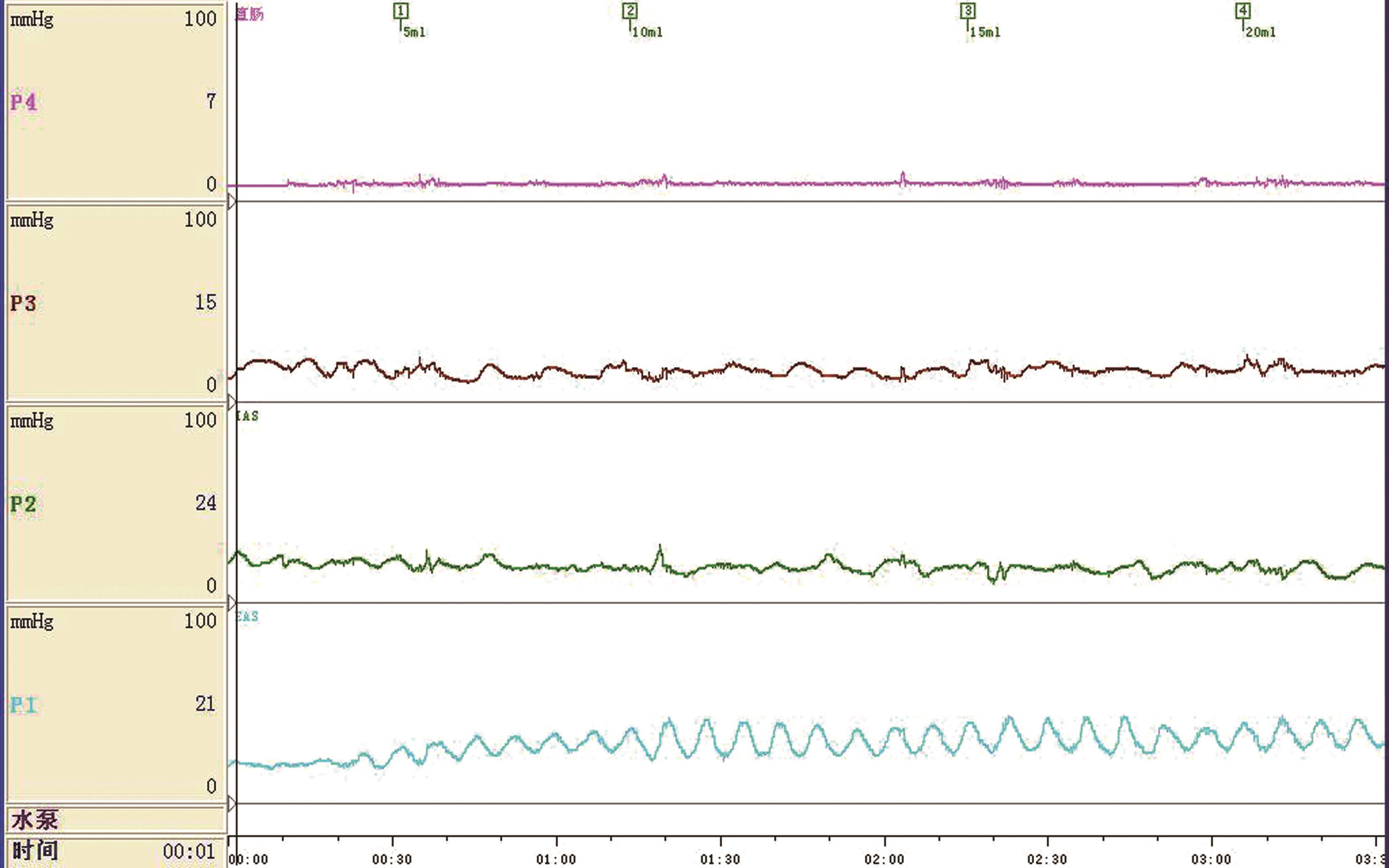 插管可引起患儿紧张不适,测量前应先让患儿适应3~5分钟,然后在安静放松状态下,测量直肠肛管静息状态下的压力,持续记录2~3分钟,作为参考基线。