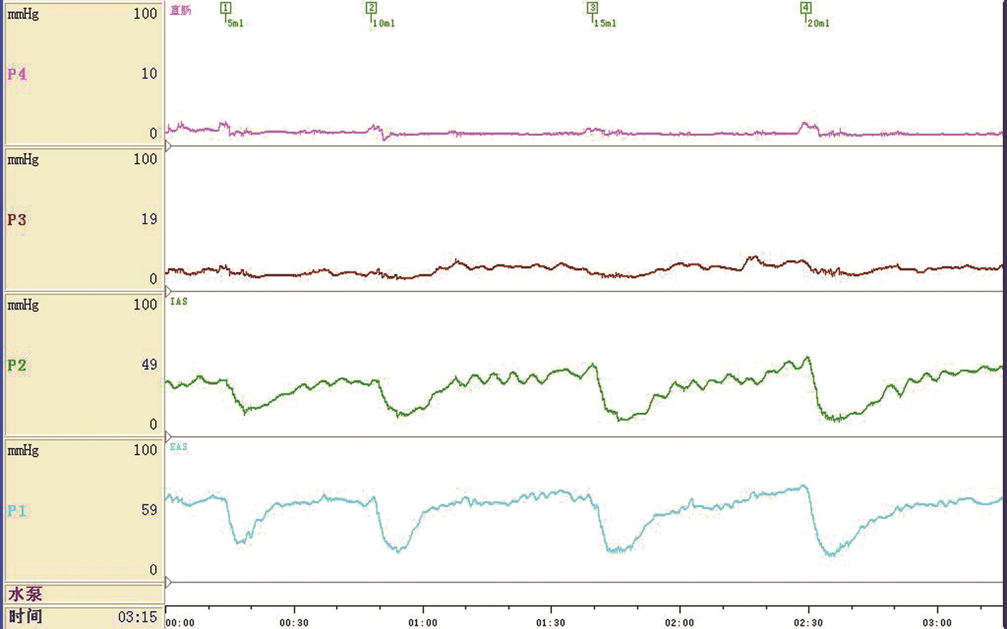 对于年龄较小的儿童,充气量一般从5ml开始,每次增加5ml,直到30ml的最大充气量。新生儿最大充气量为15ml,每次增加3ml。充气扩张气囊后,可见肛门内括约肌的静息压力快速下降,之后缓慢上升至原水平,从压力下降到恢复至参考基线的时间为11~20秒。逐次加大充盈量,记录内括约肌压力下降的幅度,可观察到随着充盈量增加,肛管压力下降的幅度也增加,反射增强。同时记录引出RAIR的最少直肠充盈量,不同年龄患儿的直肠容量阈值也不同。正常成人充气5~20ml、儿童多为5~10ml、新生儿2.5~3ml就可引出肛门内括约肌松弛反射。如引起RAIR的直肠容量阈值增高,则提示RAIR减弱。