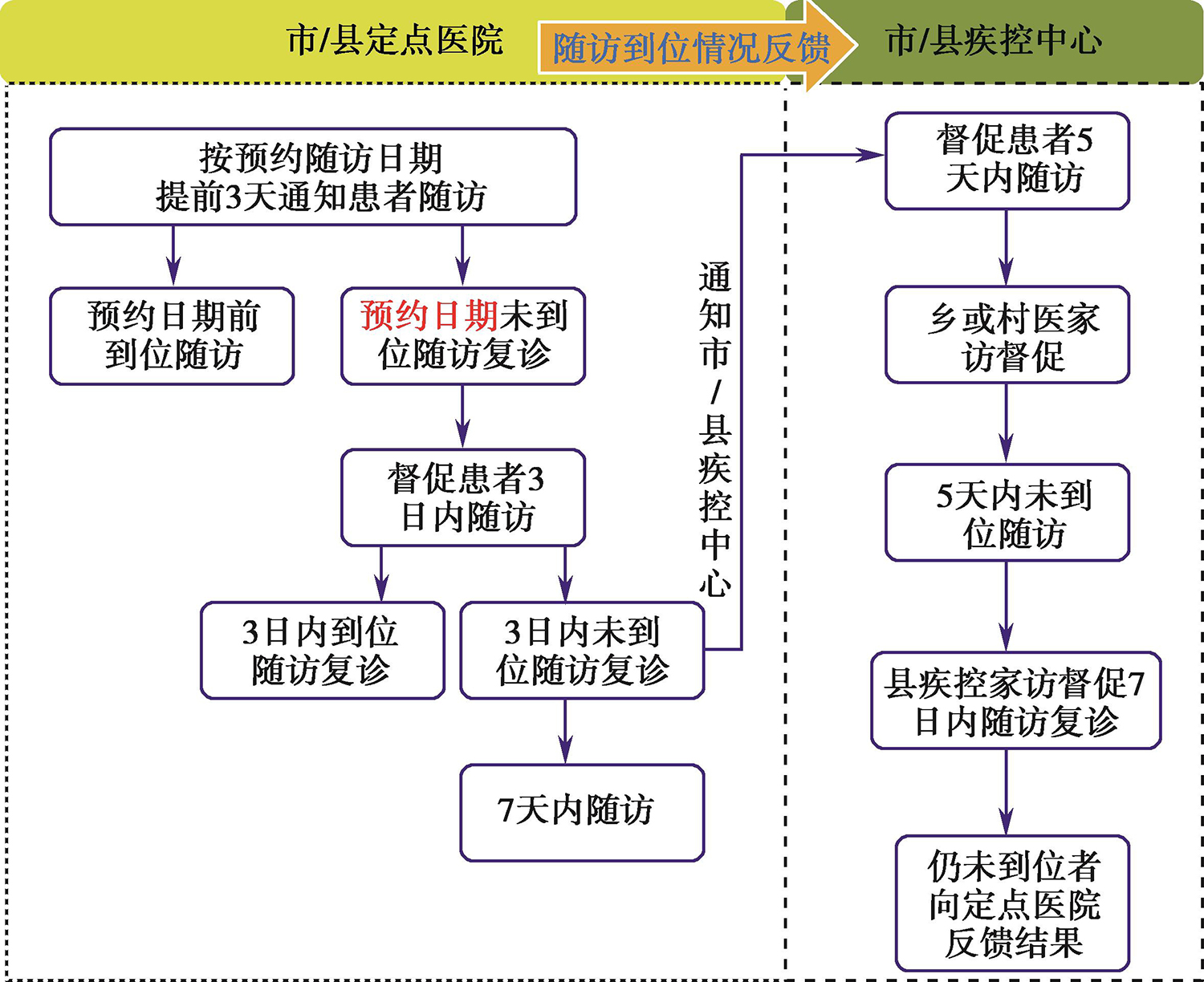 定点医疗机构发现患者未及时随访复诊,首先电话联系患者督促其3日内随访复诊,对于3日内未到定点医院随访复诊的患者,要通报辖区内疾病预防控制机构,由疾病预防控制机构通知基层医疗卫生机构安排专人进行现场追踪。