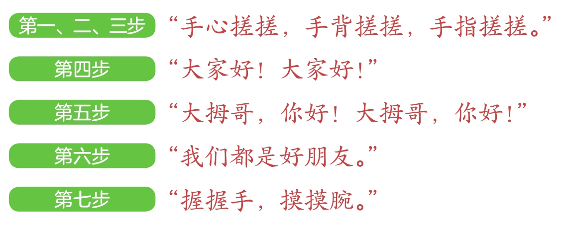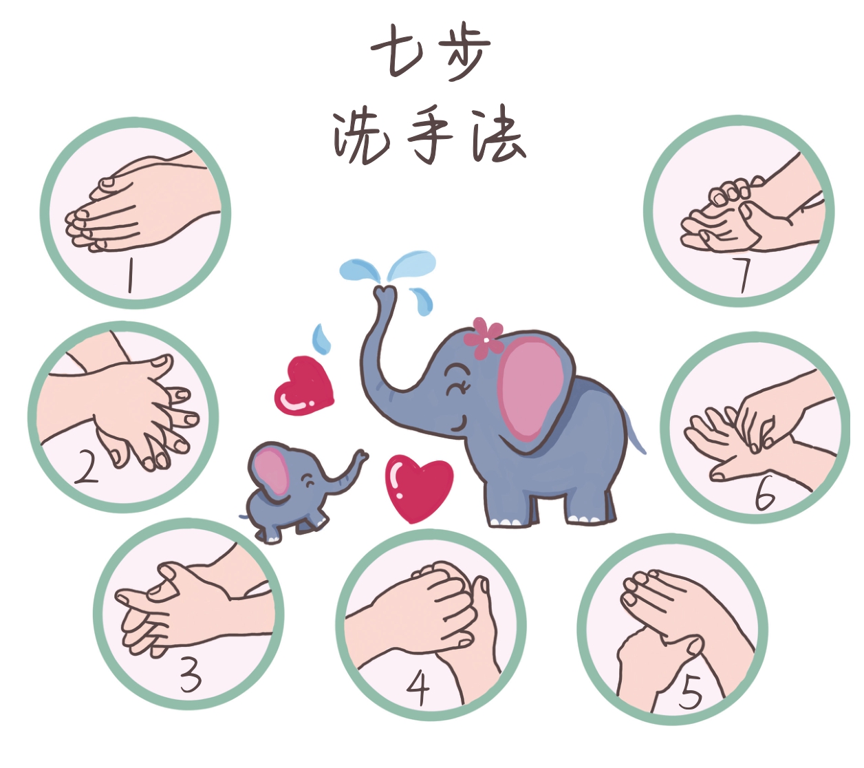 教会孩子使用七步洗手法进行洗手。“幼儿七步洗手法”如下。