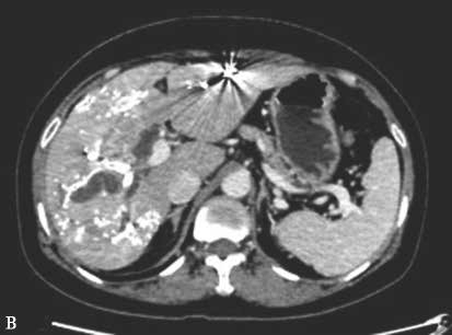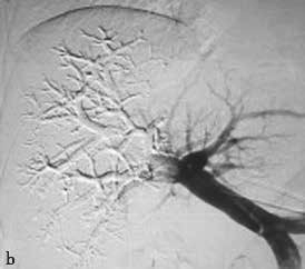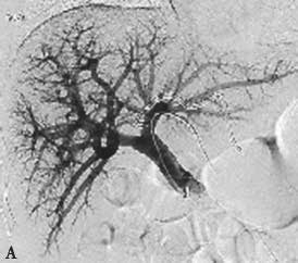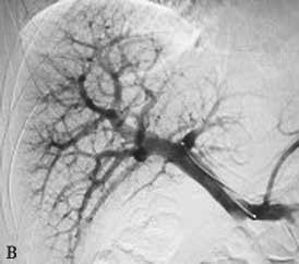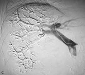 图2-5-2 选择性门静脉右支栓塞,栓塞材料移位至门静脉左支