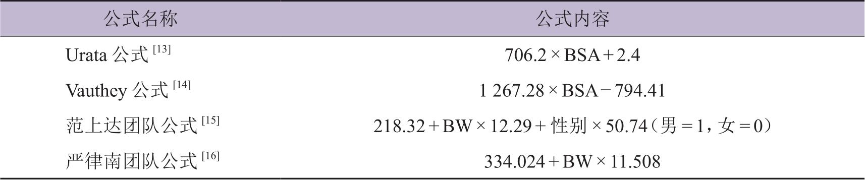 表2-5-1 标准肝体积计算公式